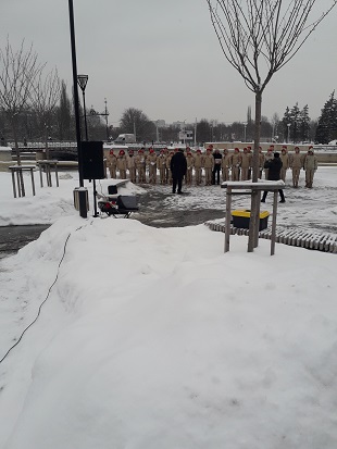 Второй день моего пребывания в Калининграде, 18 февраля, совпал с днем памяти генерала Д.М. Карбышева, замученного нацистами в концлагере Маутхаузен. Вблизи набережной, названной именем генерала, я заметил, как проспект Ветеранов пересекает колонна школьников в красных беретах и формах военного покроя. Они подошли к памятнику советским воинам и приняли участие в митинге общественности в качестве почетного караула.